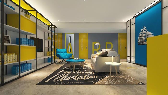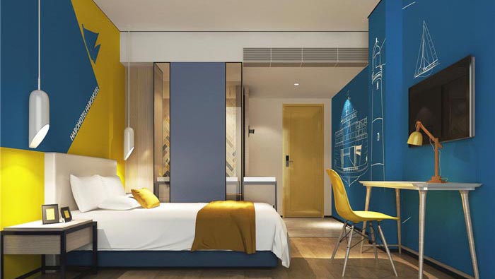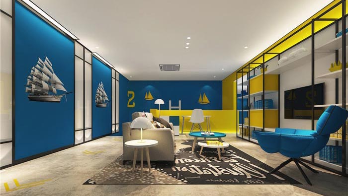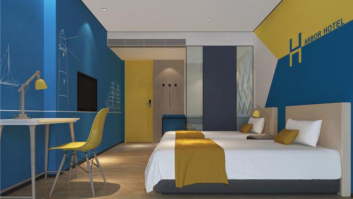 雙人間的設(shè)計:空間以藍(lán)黃兩色為主,就是希望打造一個簡約、時尚的住宿空間,仿木紋的地板、玻璃隔斷以及由花磚拼接而成的墻面裝飾,種種設(shè)計都是為了給客戶營造一種強烈的層次感和時尚感,其中藍(lán)色海洋與帆船,寓意著如家一般的溫馨港灣。