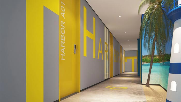 過道的設(shè)計:引導(dǎo)線加上燈塔為我們指引了方向,讓我們更加具象的了解燈塔的作用,同時風(fēng)景宜人的墻畫讓我們仿佛置身于海島之中,讓客戶在此處可以感受到海洋的魅力,讓大家對于海洋有更多的憧憬,客戶所需正是酒店所求,這也是此次設(shè)計的目標(biāo),讓更多的人了解自己、認(rèn)識自己,以此去尋找那屬于自己的心靈港灣。