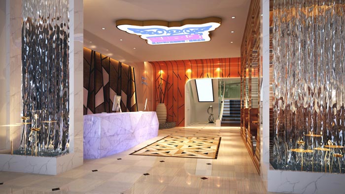 前臺的設計:在酒店的整體造型上面,設計師大致尊崇的是向內(nèi)收縮的設計格局,設計師在設計中通過對酒店客房的估算,以此估算出一天的最高人流量,然后流出預估的空間,即滿足了需求,同時在空間的設計上面也可以做到量力而行。