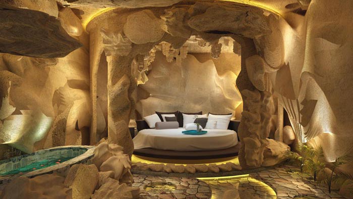 spa客房的設計:此處要是不知道還真以為是在山洞當中的酒店,在設計師看來人們現(xiàn)在需要的是一個安寧之所,此處給人的第一感覺就是心曠神怡,其中冬暖夏涼也繼承了山洞的屬性,設計師這樣做就是做到百分百相似,讓人在城市中可以體會到自然的神奇。