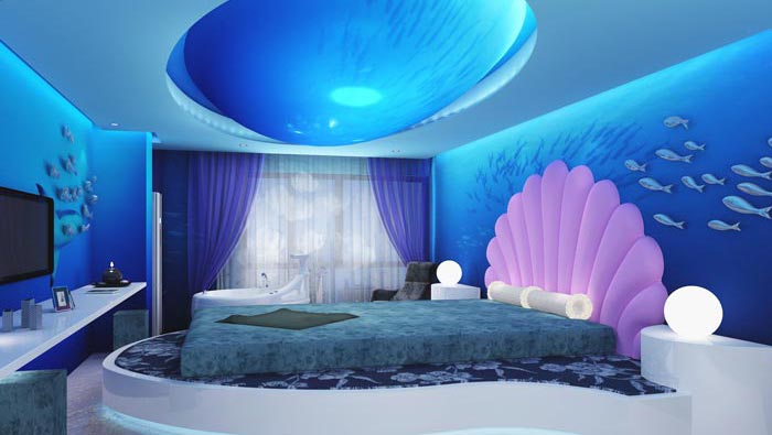 海底客房的設計:對于海底相信每一個人都充滿了好奇,設計師也不例外,故此此地是設計師為了滿足大家的好奇之心而特意設計的,頭頂月光投影在海面之上,我們躺在床上仿佛置身于海底,魚群從我們身邊游過,讓我們的思緒與魚群一起擺動,感受那不曾感受過的神奇。