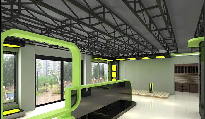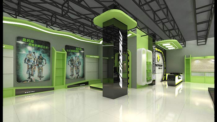 設(shè)計理念:設(shè)計師在美利達自行車專賣店裝修設(shè)計的時候,整體方案色彩以淡綠色和熒光綠的色調(diào),造型以流線型和倒圓角的造型,在實用型和美觀型很有效果!