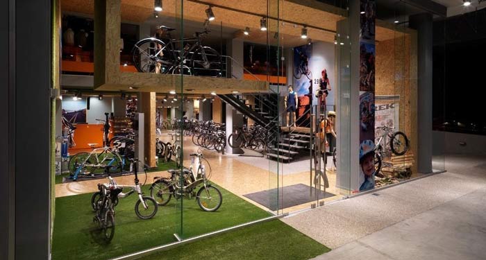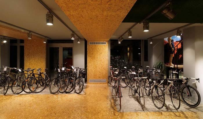 拋開這個第一印象,設計師亦花了不少心思,車店的地面面積多達400平方米,被分成4個區(qū)域,每個區(qū)域展示不同的自行車服裝和配件,城市自行車、山地自行車、競賽自行車和兒童自行車各司其職;而在150平方米的閣樓處,盡是服裝和鞋類。