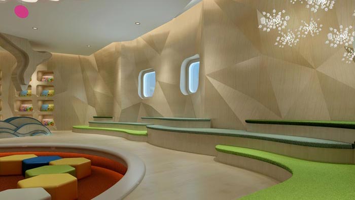 休息區(qū)域的設(shè)計:此處位于空間的一側(cè),設(shè)計師在設(shè)計中將其設(shè)計成階梯式,即增強(qiáng)了空間的容納能力,同時也充分考慮到孩子的興趣與愛好,對于階梯相信很多孩子都有很大的興趣,或上火下或休息讓孩子自己決定,企業(yè)的目的就是不強(qiáng)加給孩子任何負(fù)擔(dān),培養(yǎng)孩子自主的能力。
